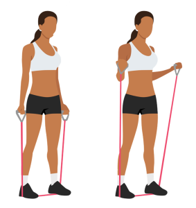 Use: Tube bands with handles or long loop bands. Stand on the band, hold the ends, and curl up toward your shoulders, then lower slowly.