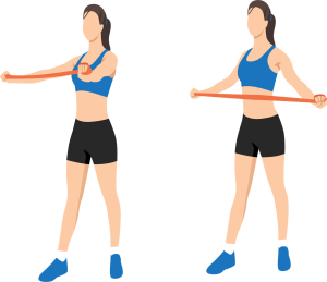Use: Long loop bands or tube bands with handles. With the band anchored under your feet, hold the band with two hands and raise your arms keeping them straight. Stop at shoulder level. Lower arms slowly and repeat.