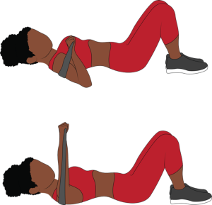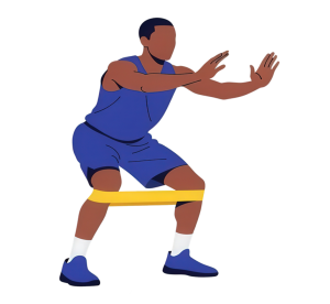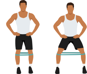 Use: Loop bands or therapy bands. Place band above or right below the knees. Sit back into a squat while gently pressing your knees outward, then stand.