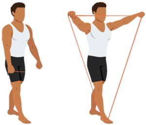Use: Therapy bands or tubes with handles. Hold the band at shoulder height and pull it apart, squeezing your shoulder blades together, then return slowly.