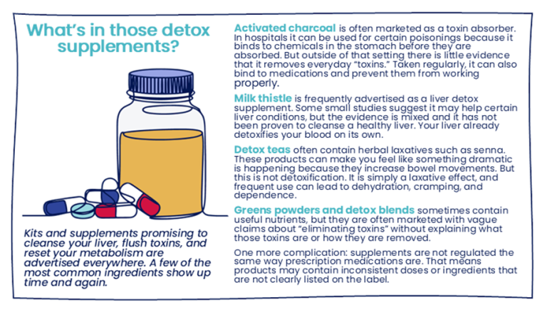 The National Institutes of Health has reviewed the research and found very little proof that commercial detox products actually improve health outcomes.