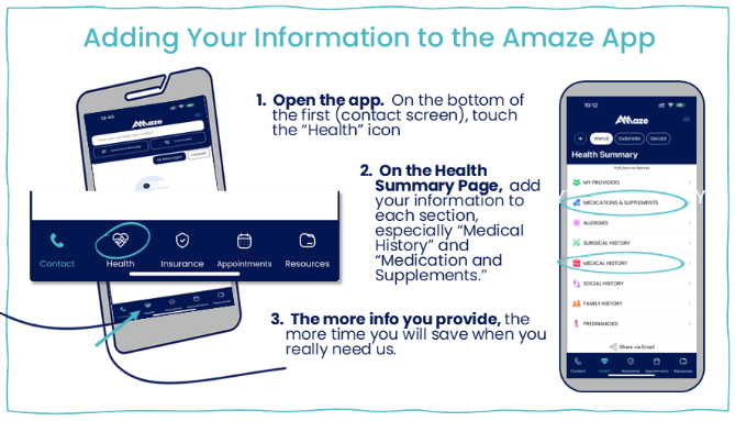 All of this should take 20-30 minutes maxYou can do it while you’re relaxing in front of the TVThe information you add to your app is immediately available to your Amaze provider when you call in. That level of care is one of the things that sets us apartAnd isn’t it worth a few minutes to take our relationship to the next level?